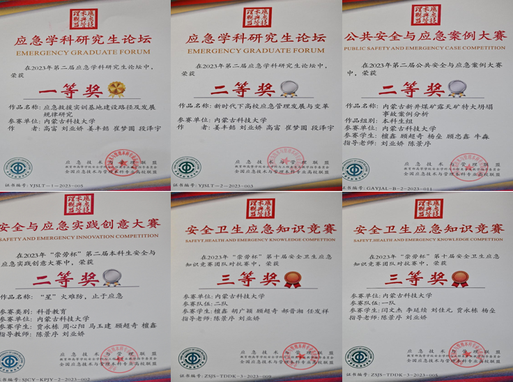 太阳成tyc122cc研究生高富、姜丰懿分别获得应急技术与管理联盟第二届应急学科研究生论坛一等奖和二等奖;贾永栋、周心阳、马玉见、顾超奇、檀鑫获“崇劳杯”第二届本科生安全与应急实践创意大赛科普教育类二等奖;檀鑫、顾朝奇、杨垒、顾忠鑫、牛淼获得应急技术与管理联盟第二届公共安全与应急案例大赛本科生组二等奖;闫文杰、李延续、刘佳元、贾永栋、杨垒组成的一队与檀鑫、胡广颖、顾朝奇、郝晋湘、任发祥组成的二队获得“崇劳杯”第十届安全卫生应急知识竞赛团队对抗赛三等奖。