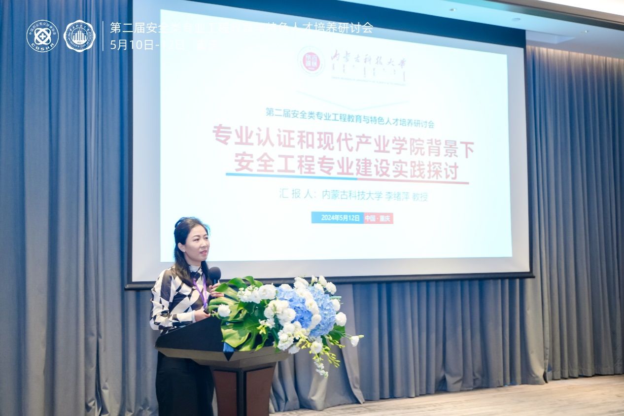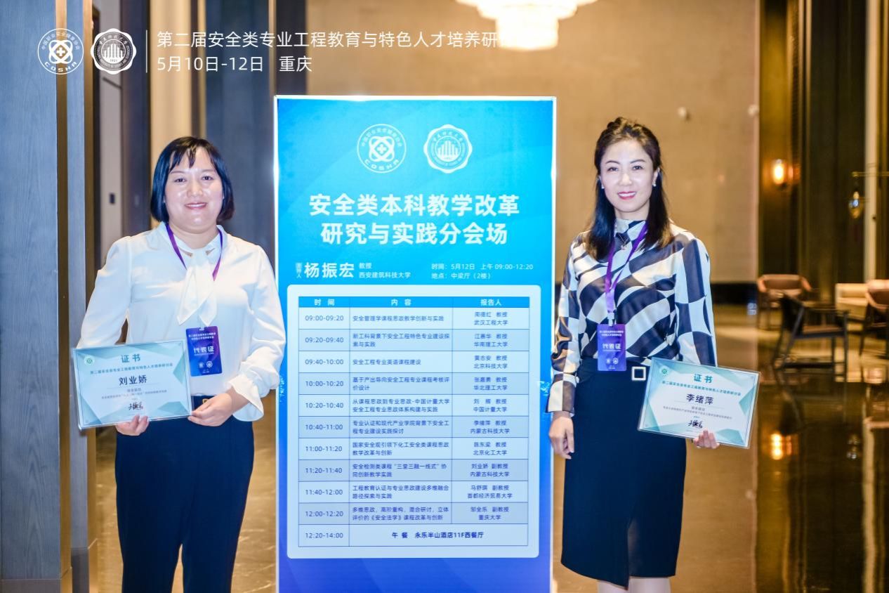 2024年5月10日-12日,第二届安全类专业工程教育与特色人才培养研讨会在重庆召开,太阳成tyc122cc教师李绪萍、刘业娇、陈景序、任玉辉、张靖参加了会议,其中李绪萍教授和刘业娇副教授发表了大会报告。