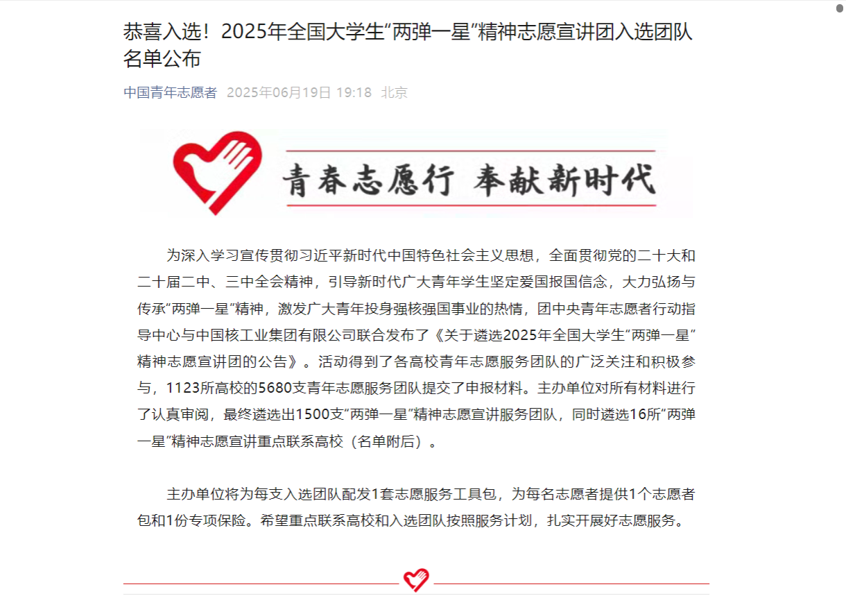 为深入学习宣传贯彻习近平新时代中国特色社会主义思想,全面贯彻党的二十大和二十届二中、三中全会精神,引导新时代广大青年员工坚定爱国报国信念,大力弘扬与传承“两弹一星”精神,激发广大青年投身强核强国事业的热情,团中央青年志愿者行动指导中心与中国核工业集团有限公司联合发布了《关于遴选2025年全国老员工“两弹一星”精神志愿宣讲团的公告》。活动得到了各高校青年志愿服务团队的广泛关注和积极参与,1123所高校的5680支青年志愿服务团队提交了申报材料。主办单位对所有材料进行了认真审阅,最终遴选出1500支“两弹一星”精神志愿宣讲服务团队,同时遴选16所“两弹一星”精神志愿宣讲重点联系高校。公司太阳成tyc122cc“煤”好星辰志愿宣讲团成功入选。