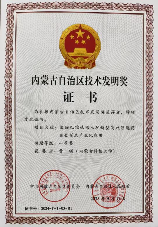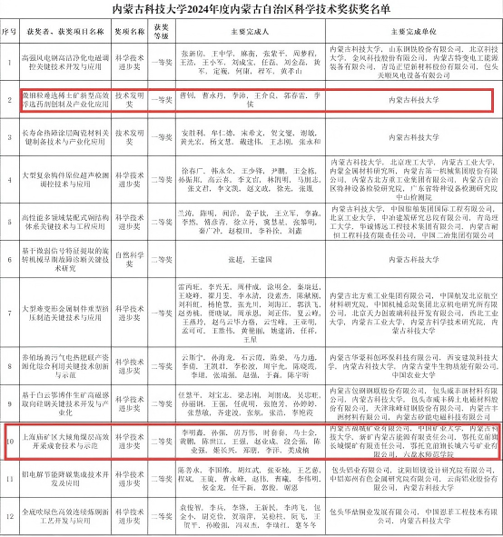 11月27日,2024年度内蒙古自治区科学技术奖励大会在呼和浩特市召开,表彰为全区科技进步和高质量发展作出突出贡献的科技工作者。大会公布了2024年度自治区科学技术奖获奖名单,公司教师参与的多项成果荣获自治区科学技术奖,曹钊教授团队的“微细粒难选稀土矿新型高效浮选药剂创制及产业化应用”获得技术发明奖一等奖,段会强老师参与“上海庙矿区大倾角煤层高效开采成套技术与示范”获得科学技术进步二等奖。
