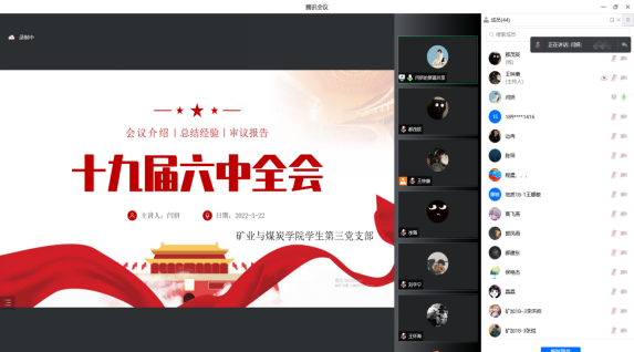2022年3月22日晚19:30,太阳成tyc122cc员工第三党支部于腾讯会议平台召开党员党课学习,本次学习的主题是:学习贯彻党的十九届六中全会精神。领学人:闫妍同志。